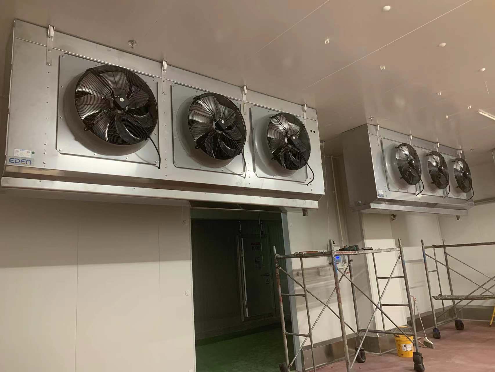 冷库冷风机为空气冷却器又名是一种集降温、换气、防尘、除味于一身的蒸发式降温换气机组。它适合用于各种冷库的冷却降温设备,它具有结构紧凑、重量轻、不占用冷库使用面积。库温均匀,效率高等优点。使冷库内贮藏的食品迅速降温,大大提高了贮藏食品的保鲜度。冷库冷风机主要由冷却换热排管、轴流风机、分液器、容霜装置、接水盘等5大重要部件组成。